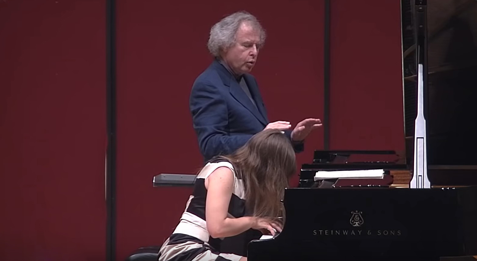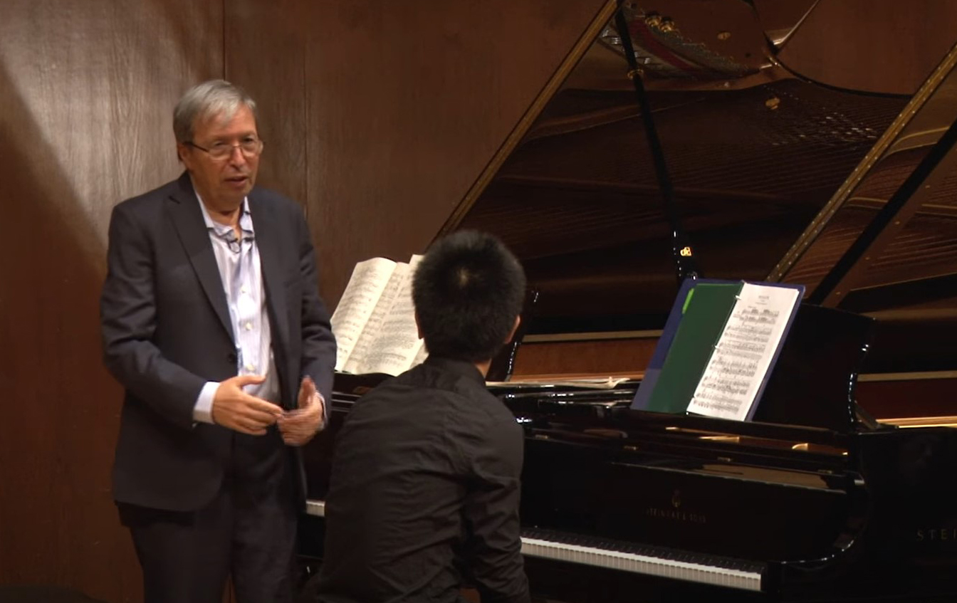 On 12 October 2017 at the Juilliard School, Perahia taught the first movement of the “Hammerklavier” Sonata (as of 9:20ff.). The Chinese student Qi Xu is exceptionally talented, well prepared and can immediately implement many instructions by Perahia, who first unfolds his impressively deep analytical knowledge, referring to the fugato’s inner relationships. Just in time before the master class turns into an analysis session without any students, Perahia has Qi Xu play (from 24:20ff.). Perahia works very intensively and with an extreme textual analysis. “I don’t want it to be fingerwork”, “I hear accents all over the place. But I wanna hear e flat – f – g”. He is constantly correcting, also playing a lot himself, conducting, singing, and finding wonderful images to improve the student’s sound concept (e.g., “fountain”, “heaven”, “for a moment he looks at the dark side”).
