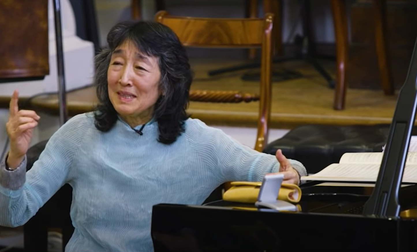 Then, from 1:20:20ff., the audience, hanging on her very lips, may ask questions. The very first gives Uchida the opportunity to emphasise how crucial it is that an artist play not “only” the notes “correctly” (that’s worth nothing), but that he/she try – subjectively – to understand “what is behind the notes”, that he/she feel every note and phrase (“through my body”); only then is his/her actions justified and only then will he/she reach the audience. “What remains is what is written”.